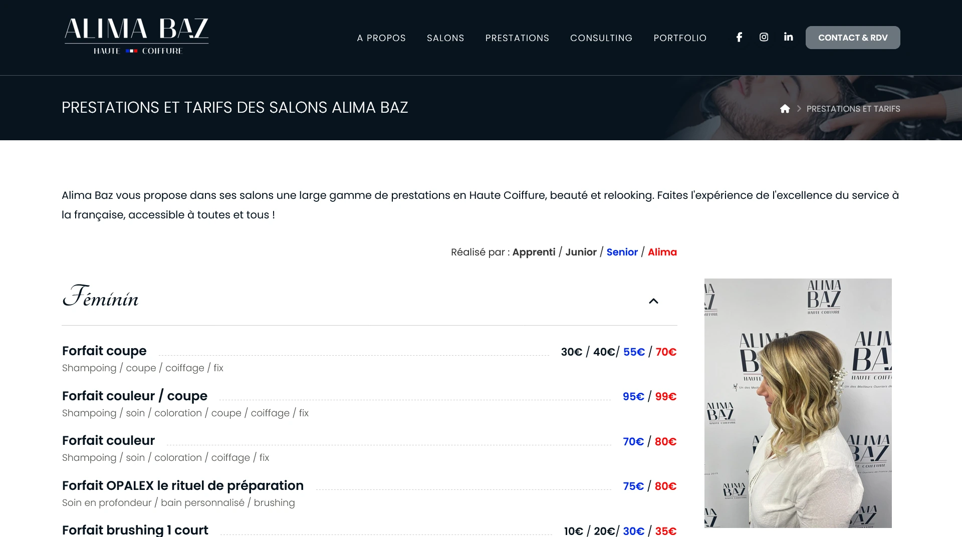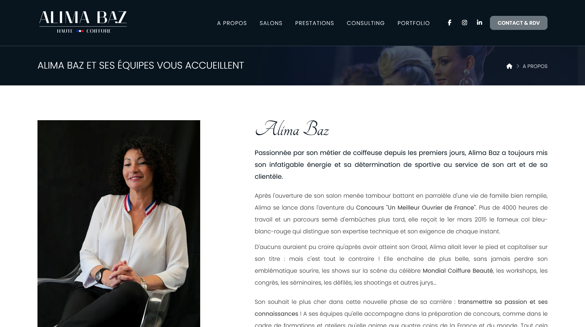 Le site est totalement réorganisé avec des rubriques simples, qui permet de connaître son parcours professionnel d'artisan, retrouver les infos pratiques sur ses salons, les tarifs de toutes les prestations, son travail de coach et formatrice, une galerie photo que ses équipes peuvent alimenter facilement, et bien sûr un formulaire de contact sécurisé ! Le tout avec un code source optimisé pour le SEO. La prise de rendez-vous en ligne est assurée par un système externe via des liens dédiés.