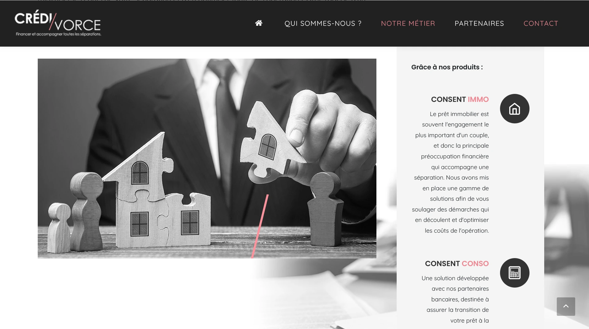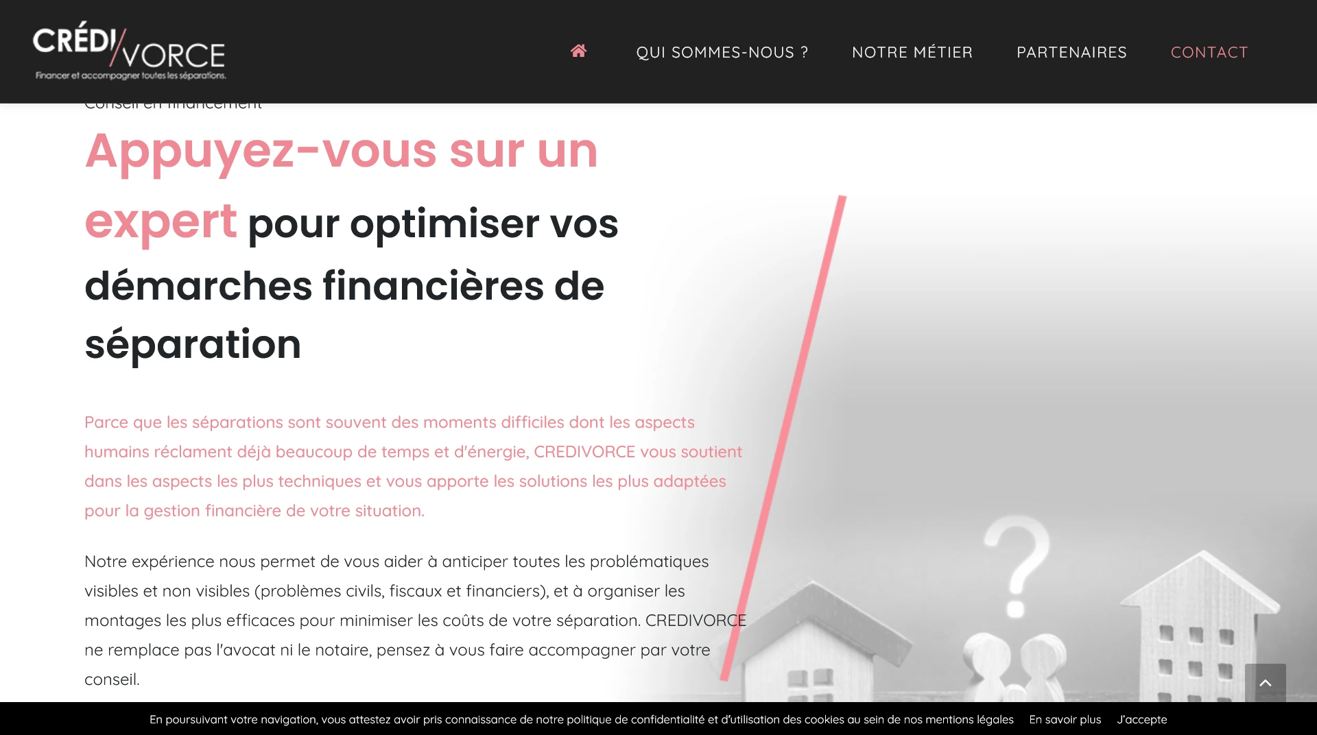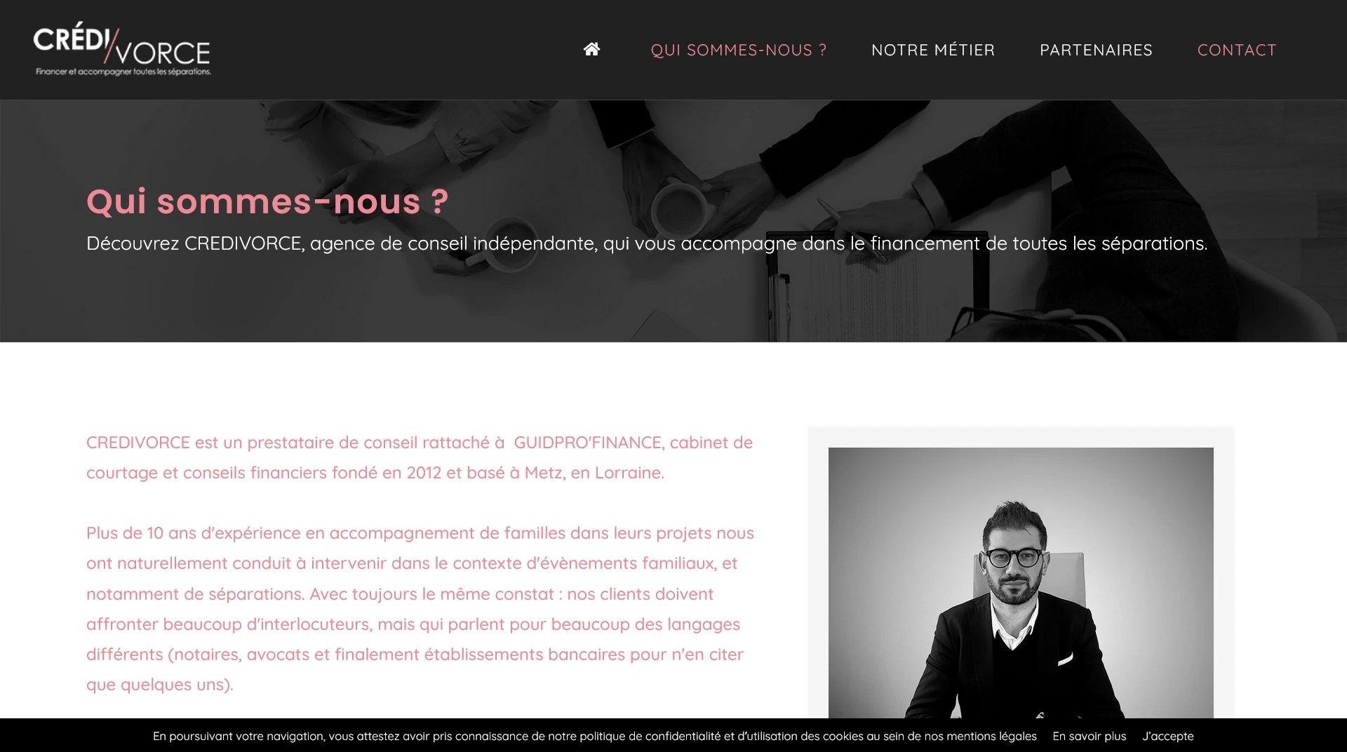 Pour satisfaire à l'exigence de rapidité et de praticité, nous avons décidé de créer un site jumeau du site GUIDPRO'FINANCE, dont nous avons adapté la charte graphique aux couleurs de la marque CREDIVORCE.